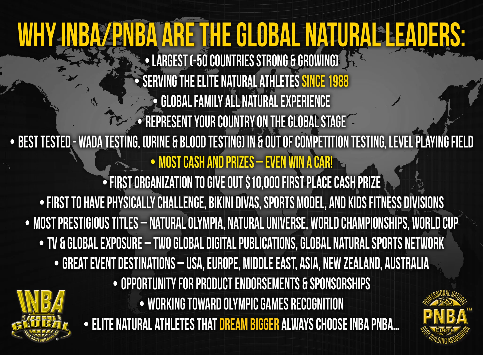 INBA PNBA GLOBAL is the World's Largest, Best Tested, and awards the Most Cash & Prizes. Elite Natural Athletes enjoy the opportunity to compete in the most exciting venues all over the world. Pro Am World Championships "Italy" Pro Am Natural Universe "New Zealand" and Pro Am Natural Olympia "Las Vegas"